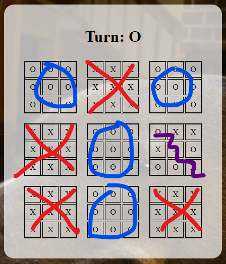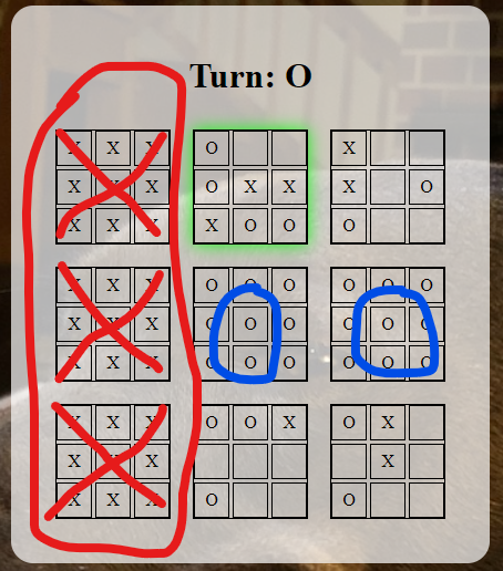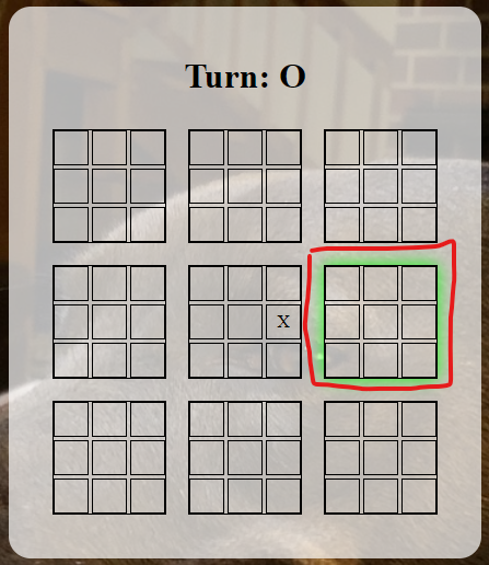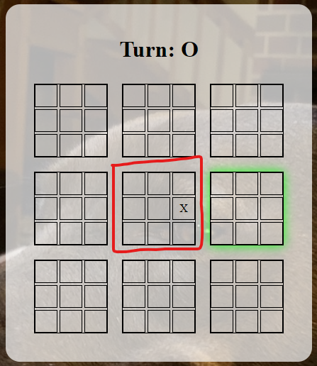 - Player 2 must place O in the center right 3x3 grid of the board (corresponding to the position of Player 1’s mark).