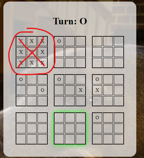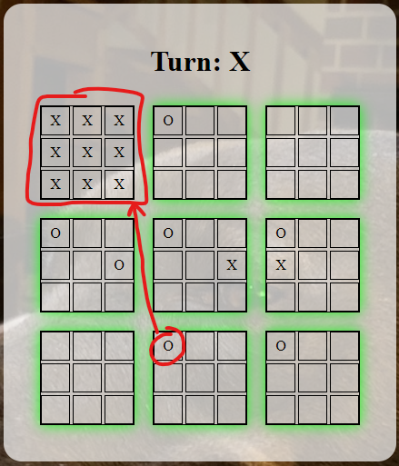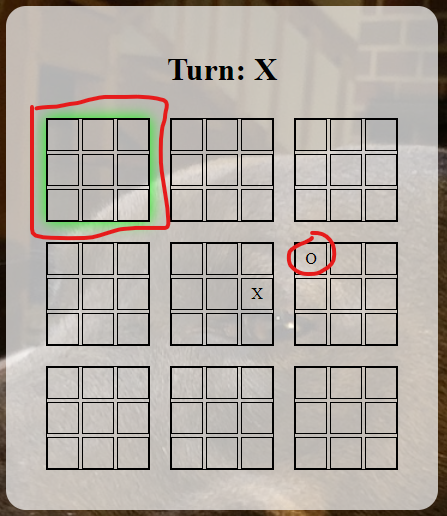 - Player 1 must now place their mark in the top-left 3x3 grid of the board.